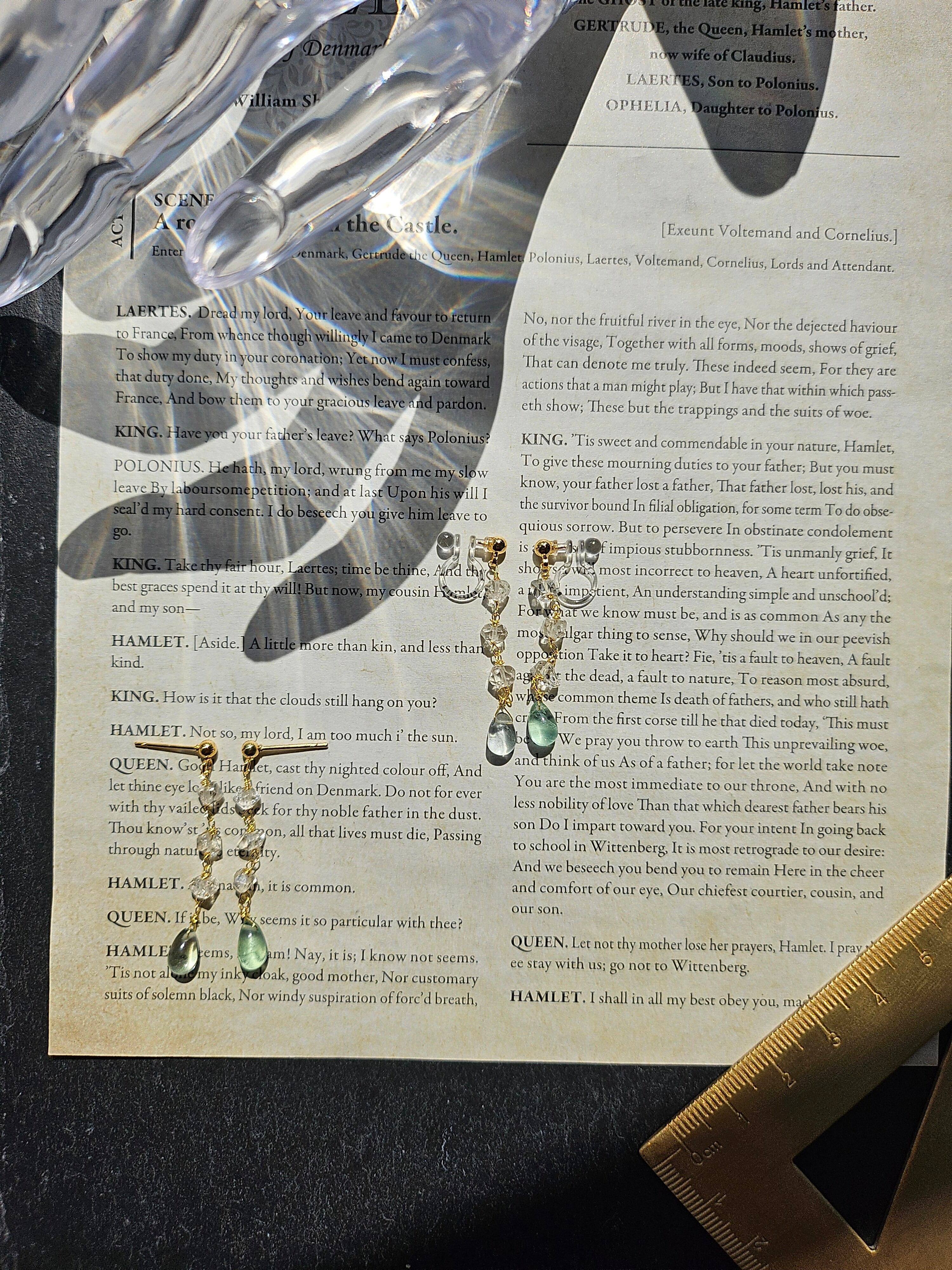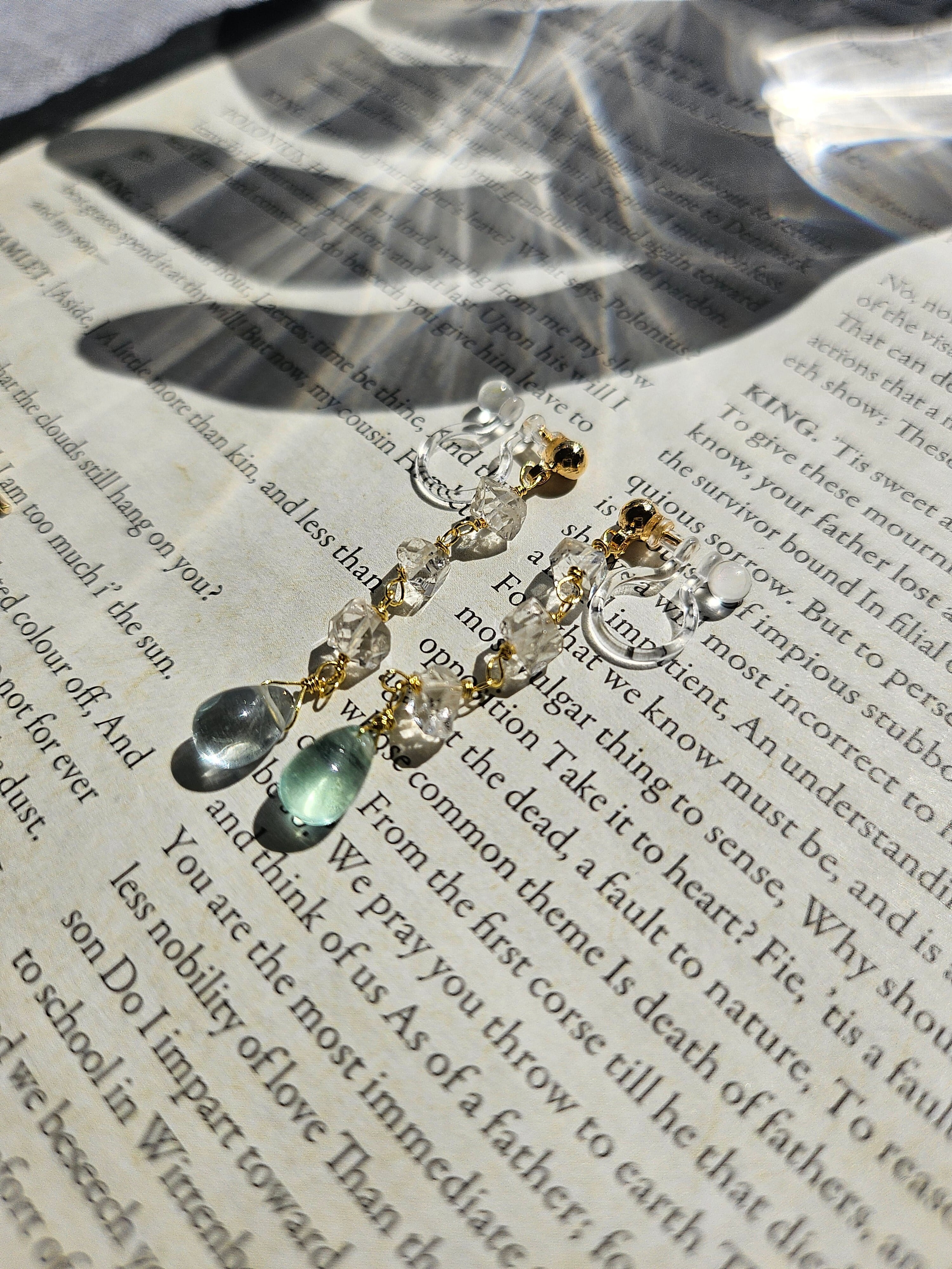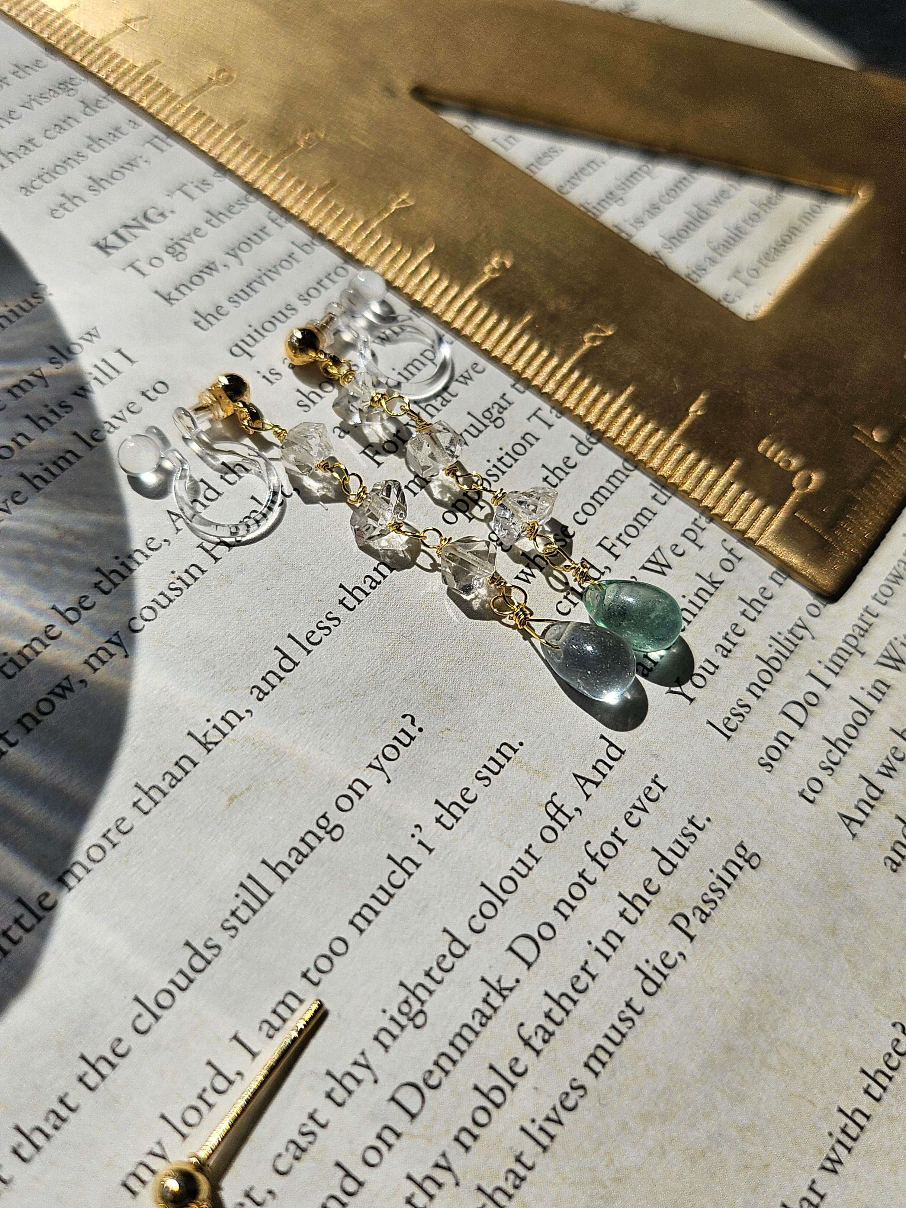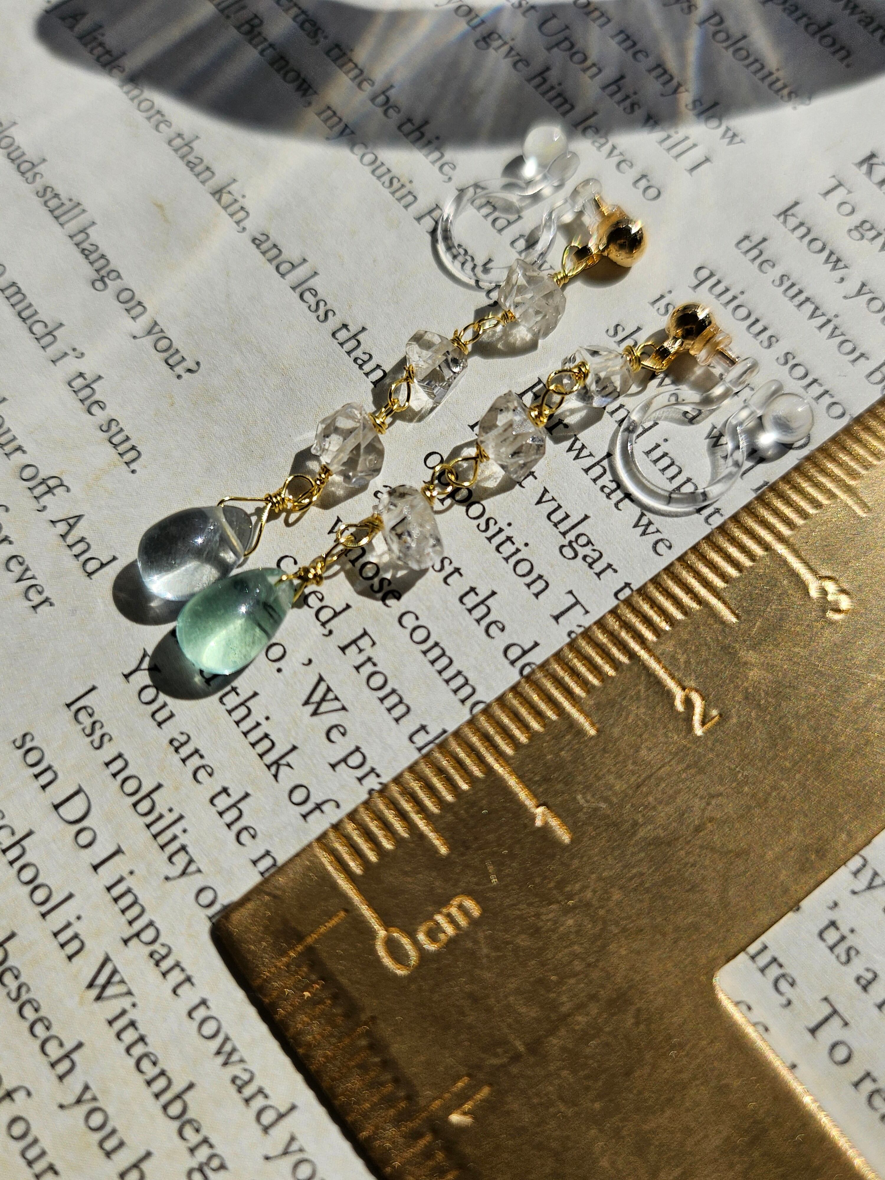 連なるハーキマーダイヤモンドとフローライトのイヤリング