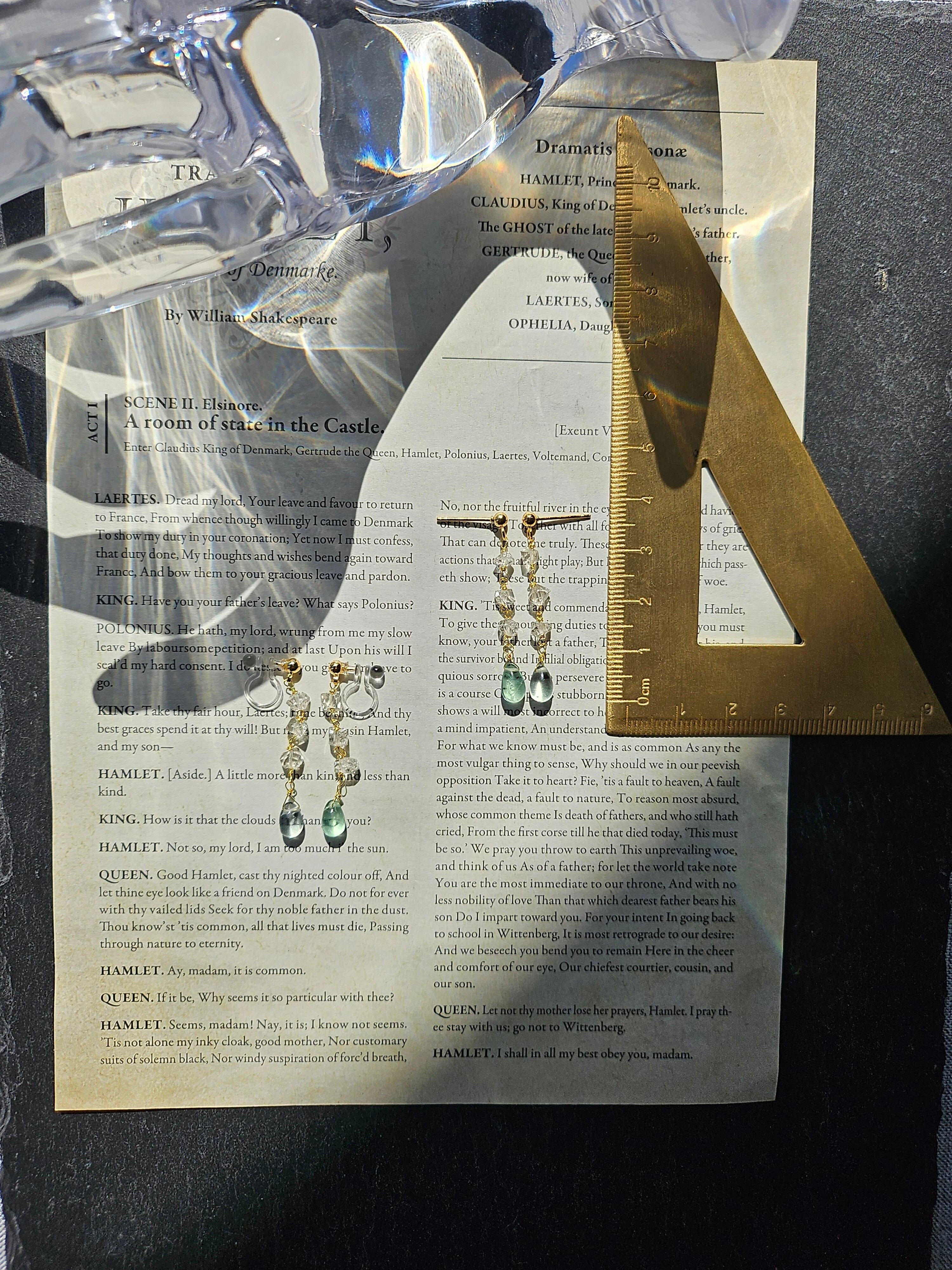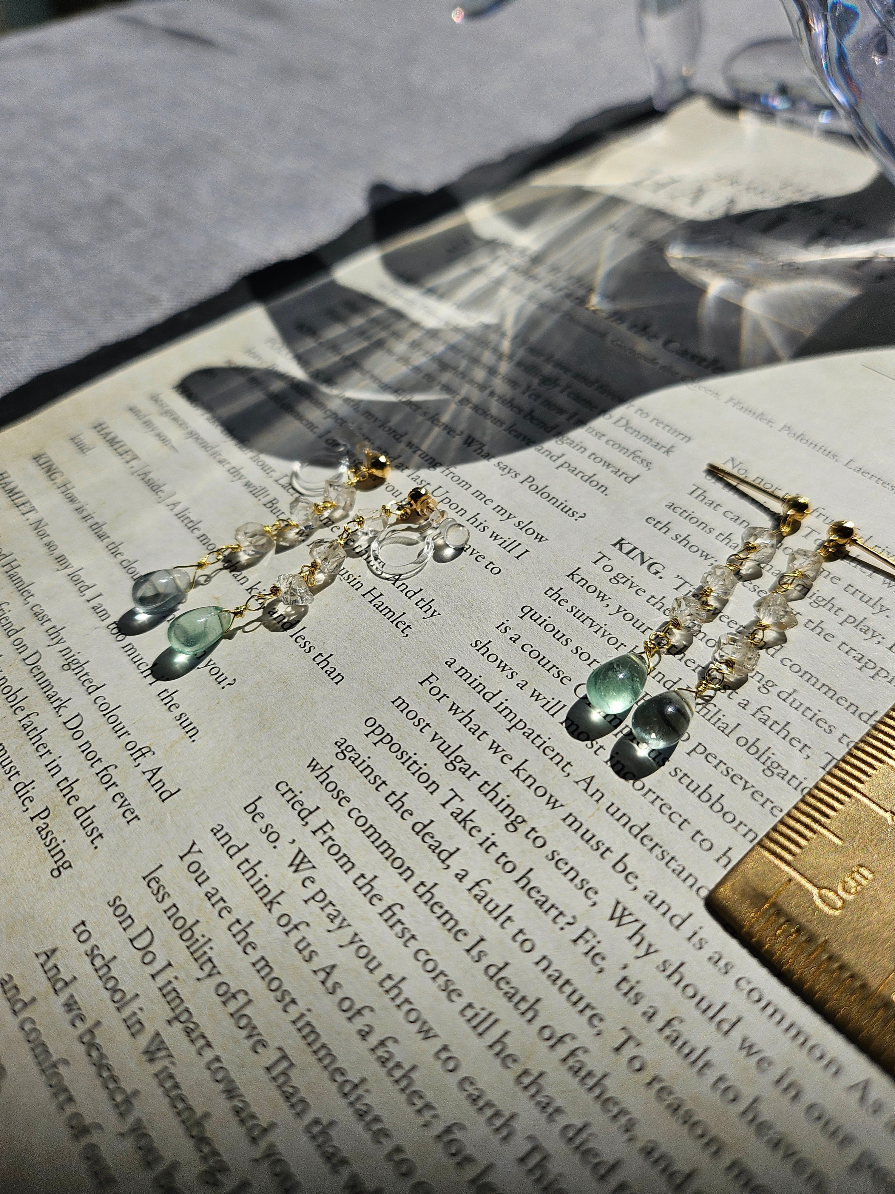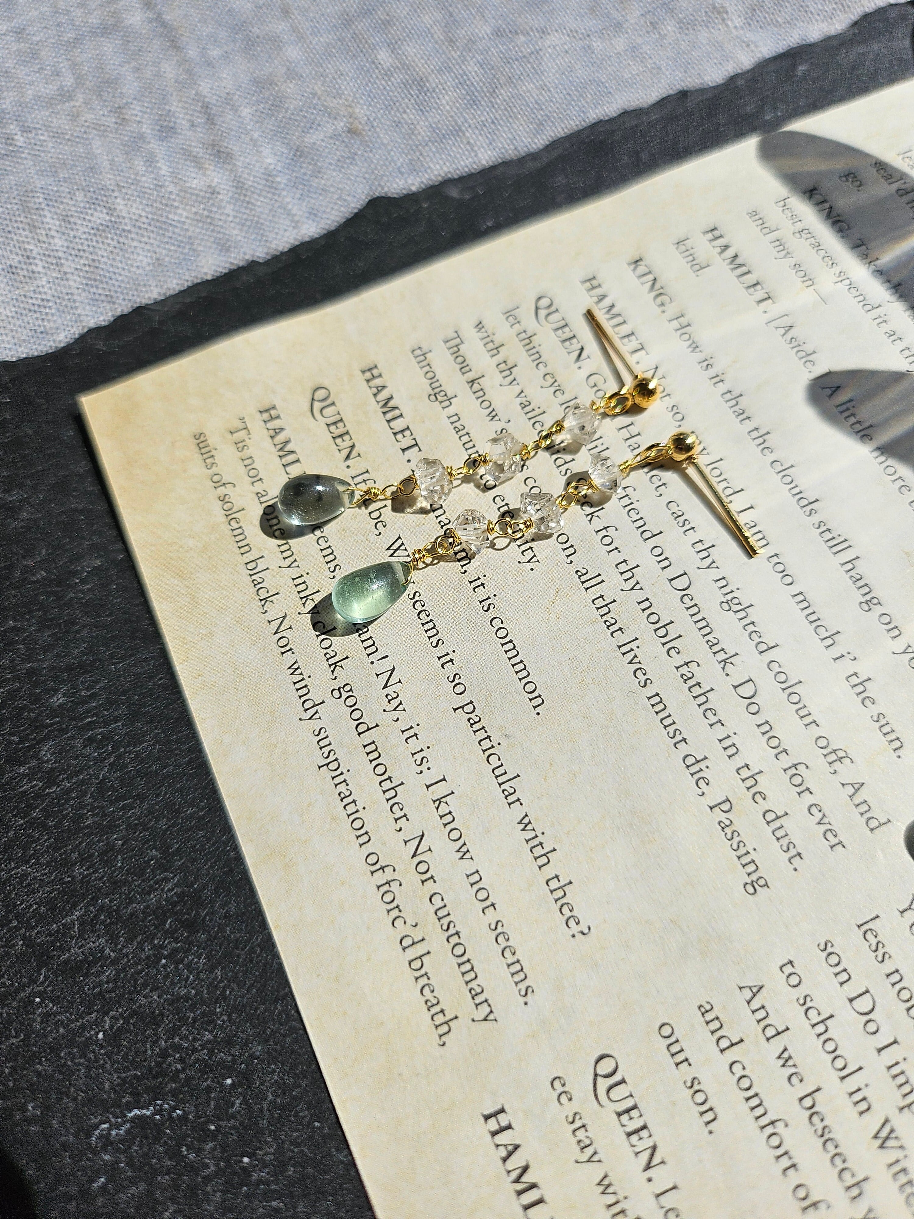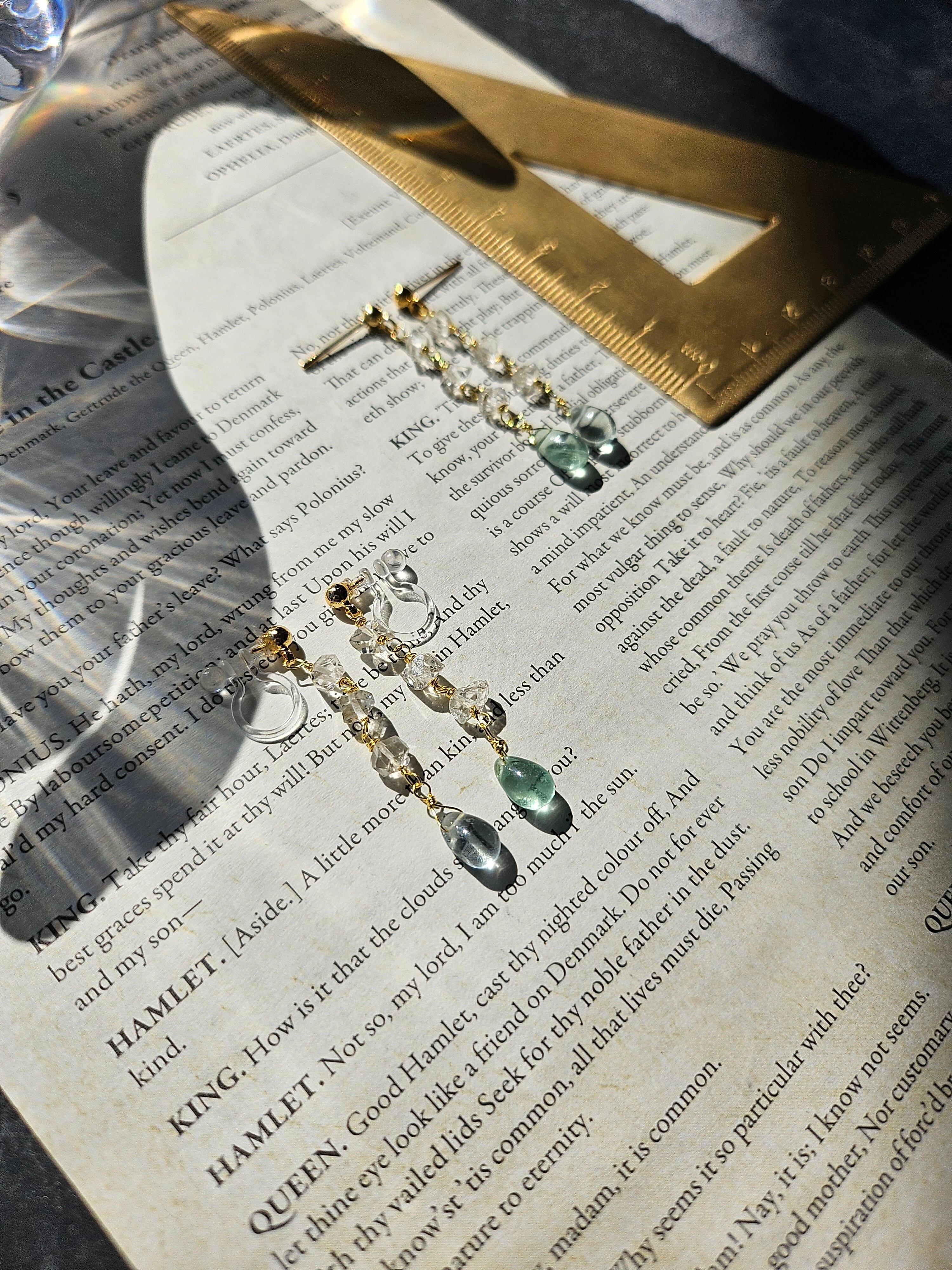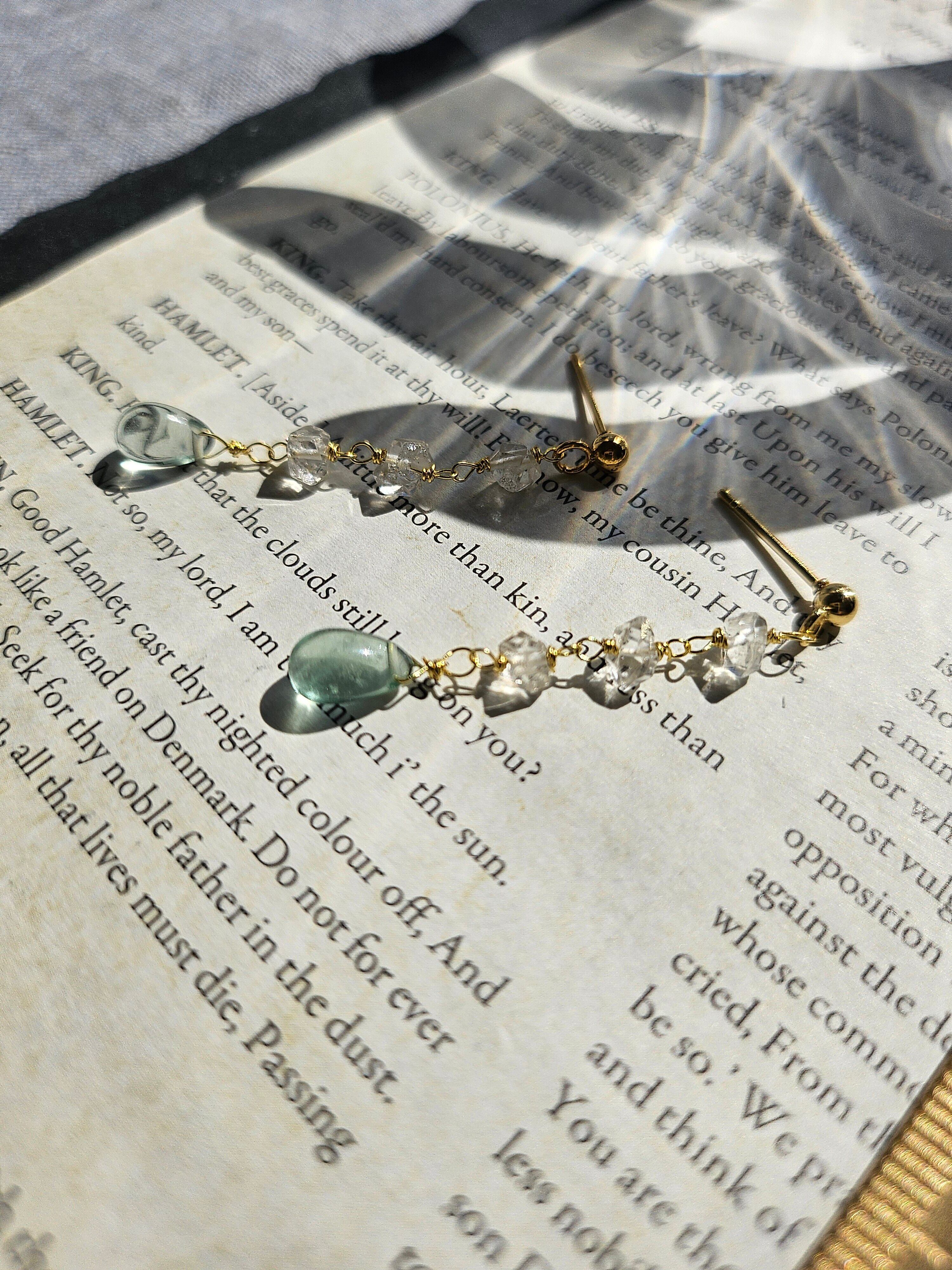 連なるハーキマーダイヤモンドとフローライトのピアス