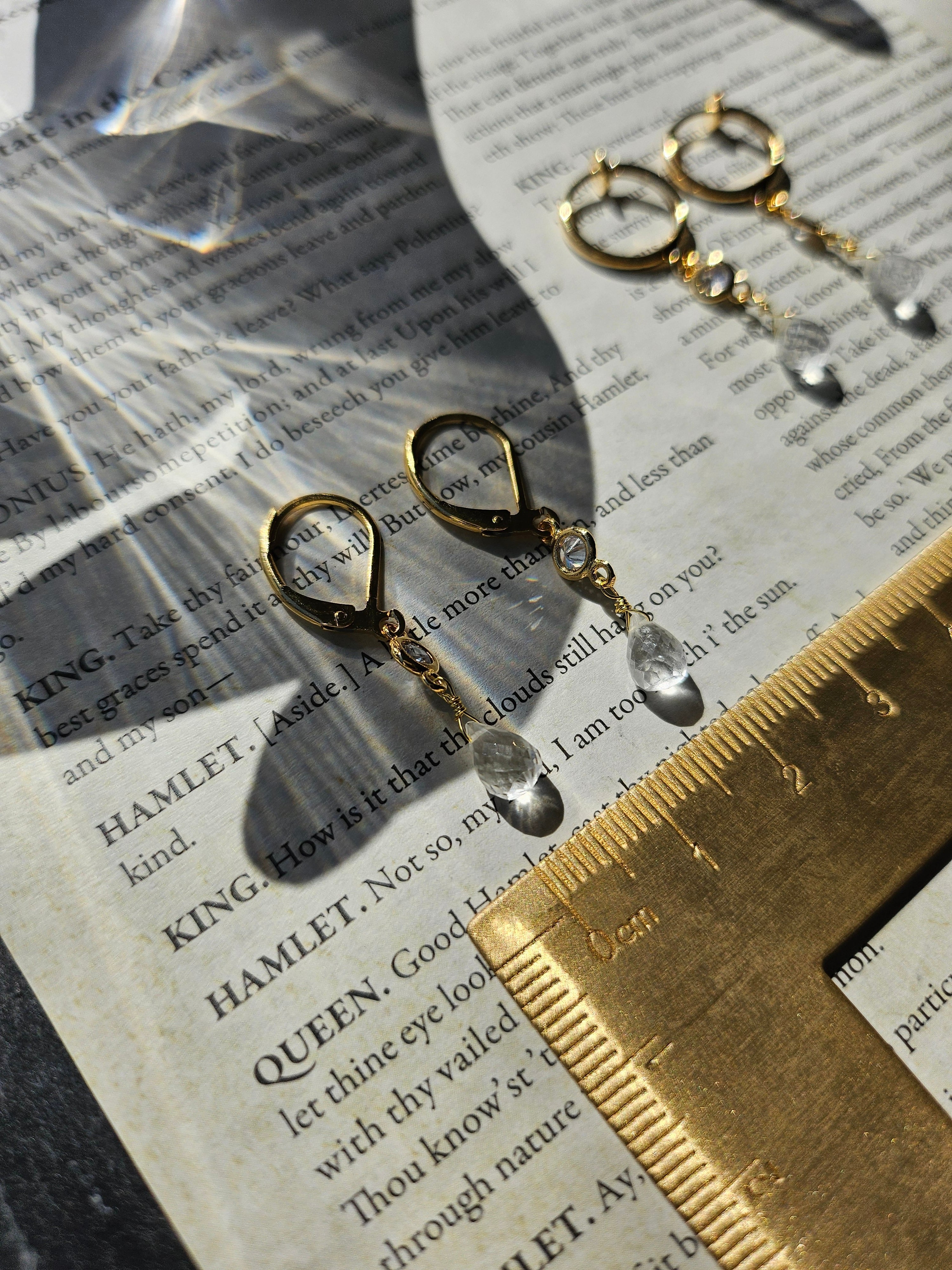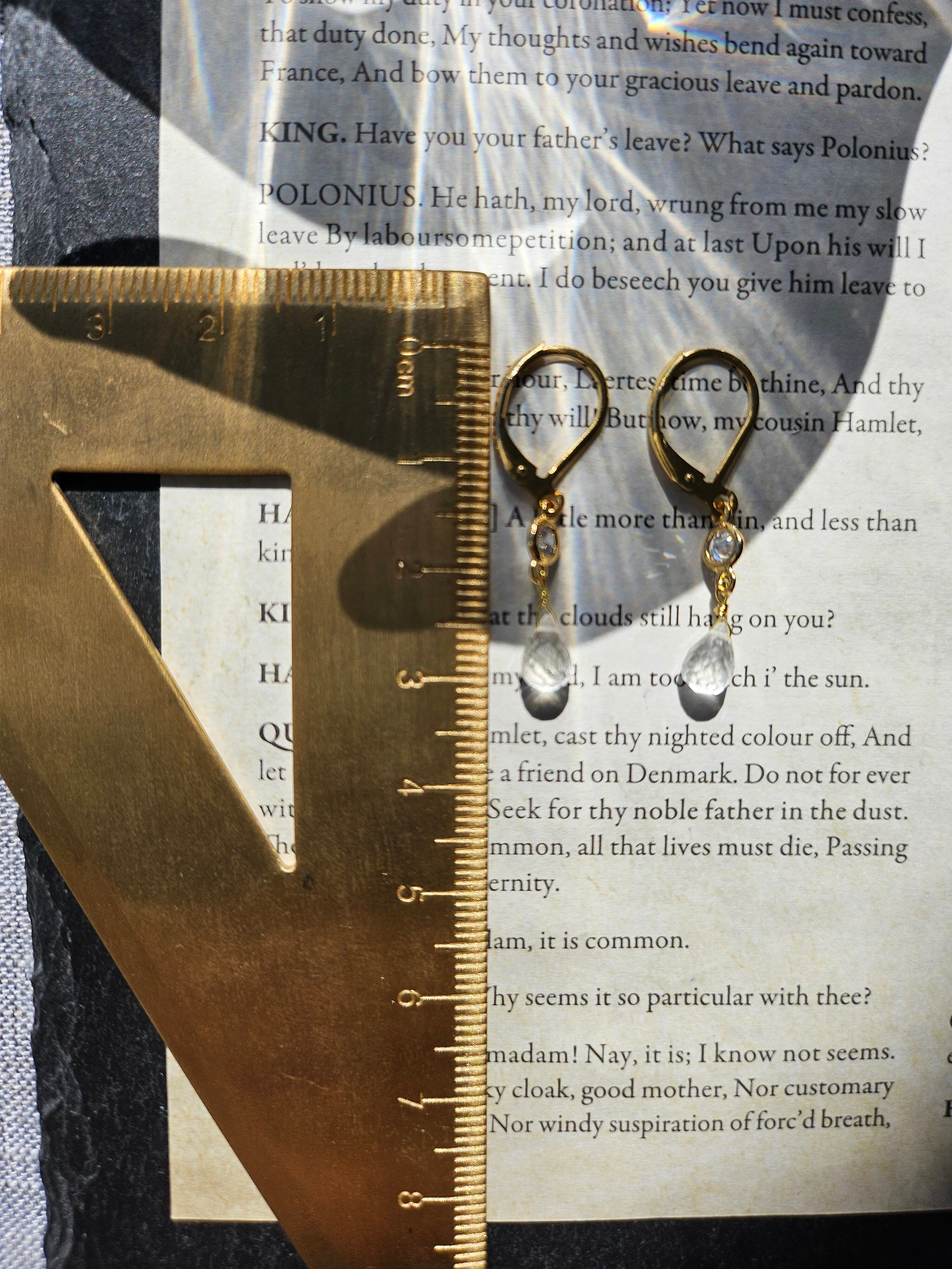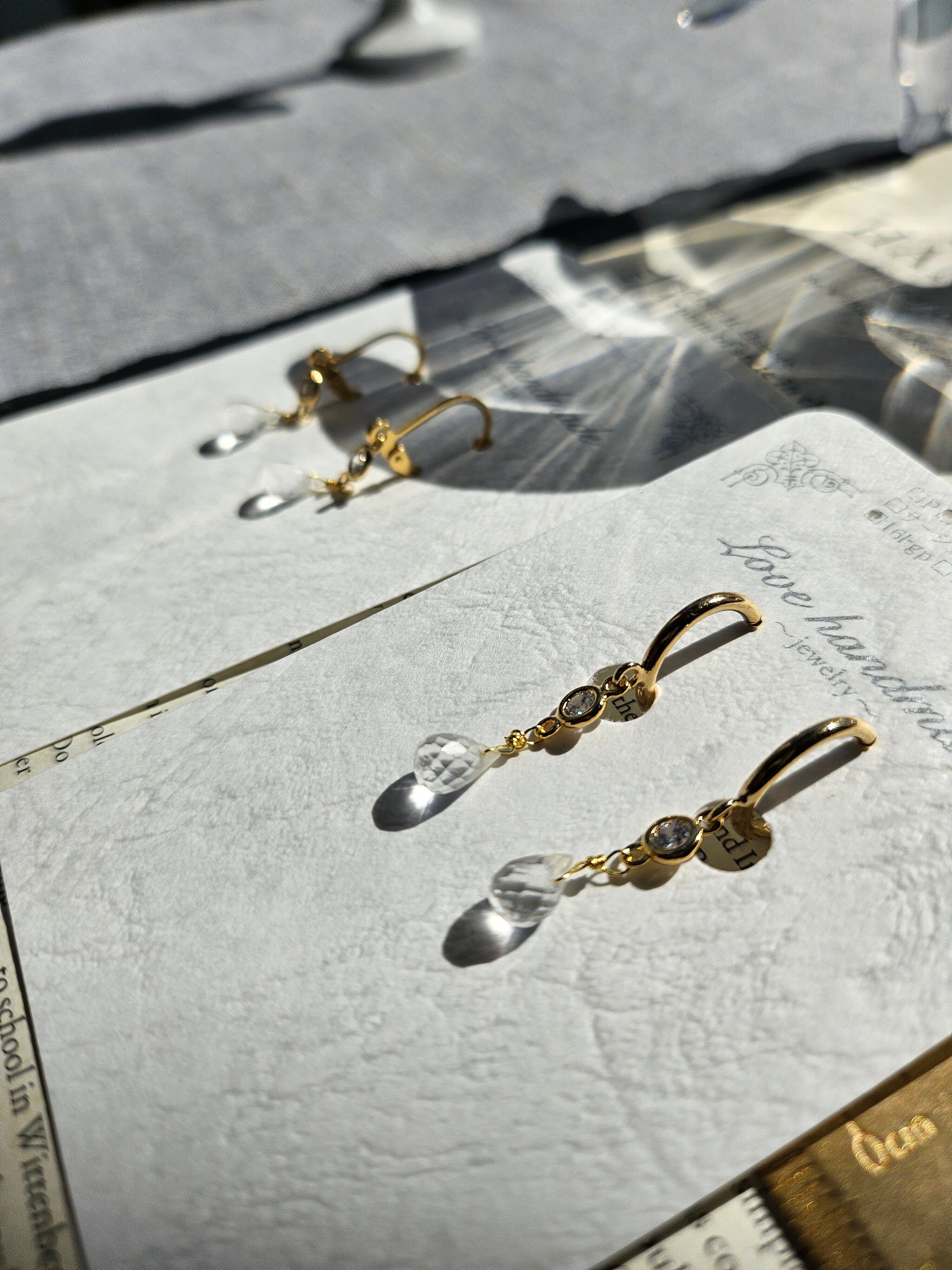 光を反射してきらめくキュービックジルコニアと細かなカットが施されたドロップ型の水晶が耳元に華やかさを添えます。