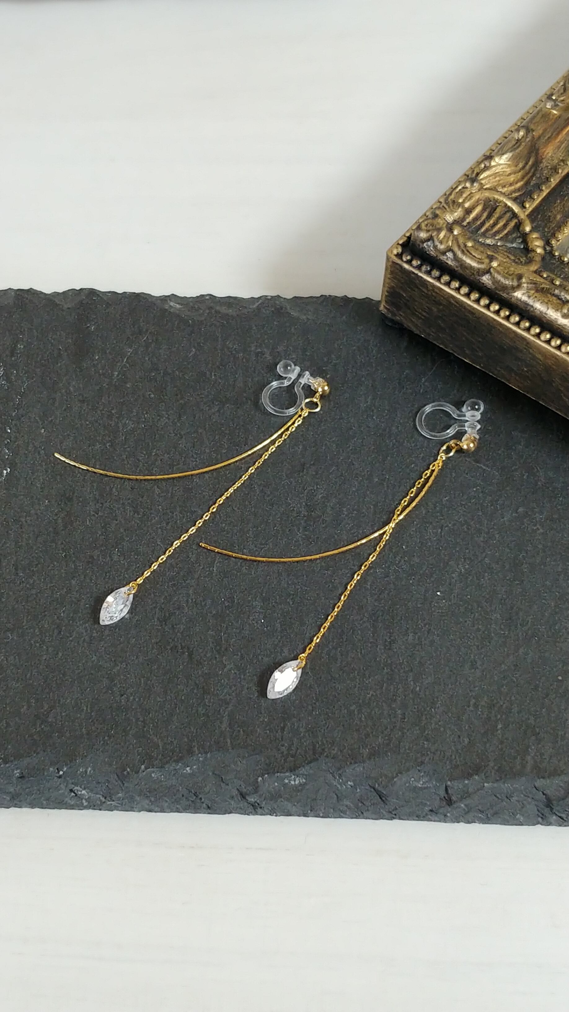 ホースアイとも呼ばれるマーキス型のCZが上品に揺れるアメリカンピアスです。