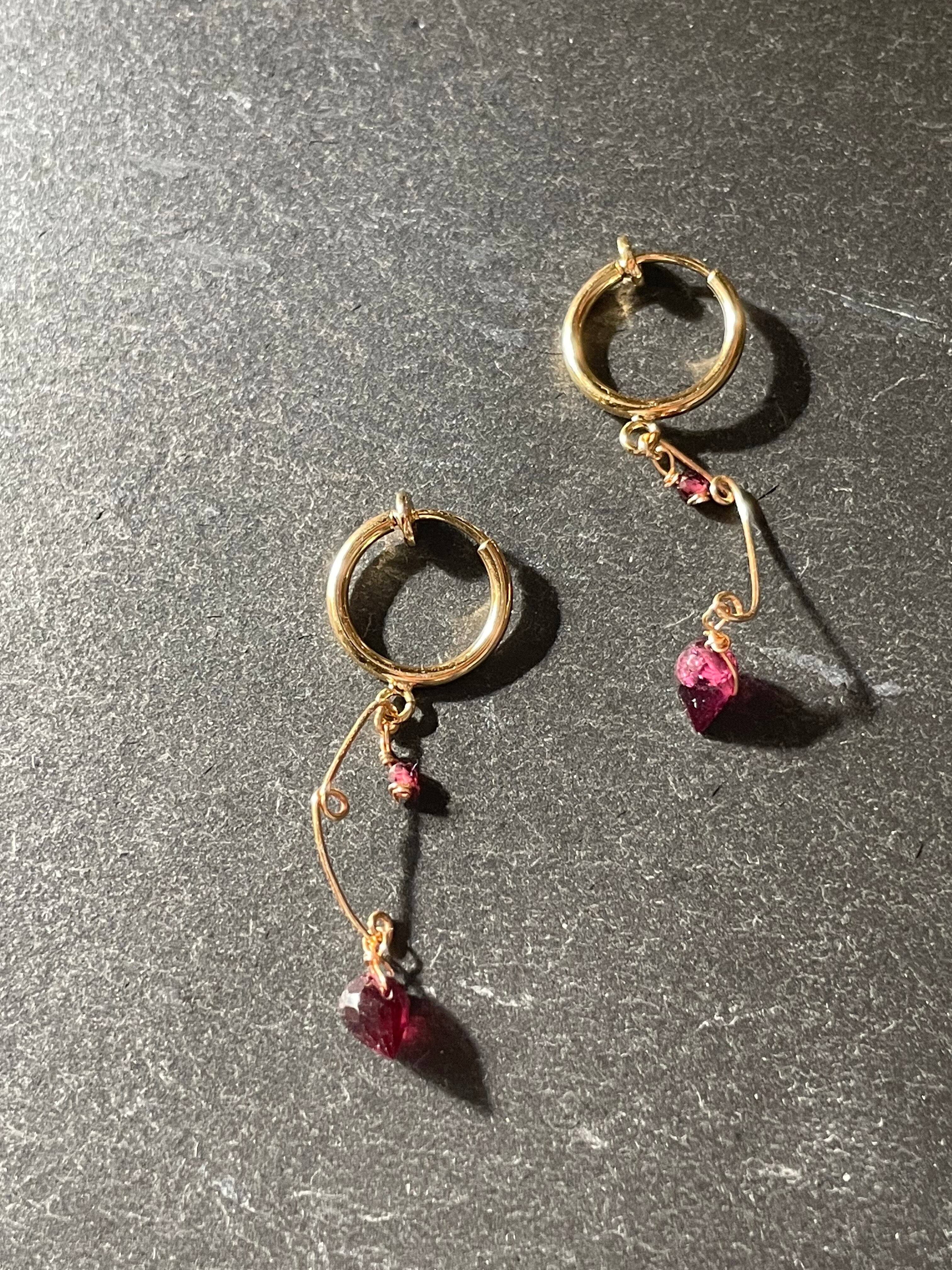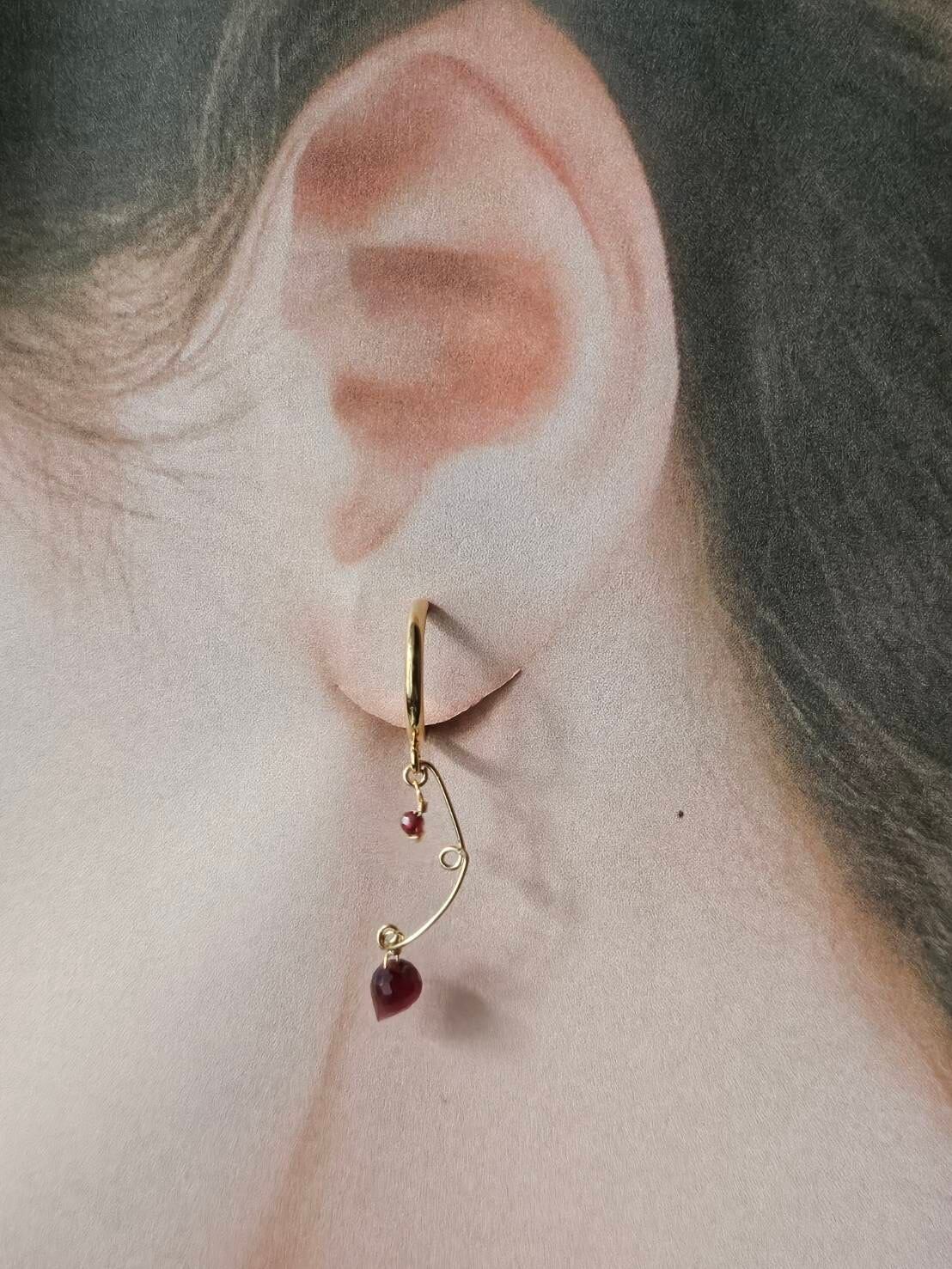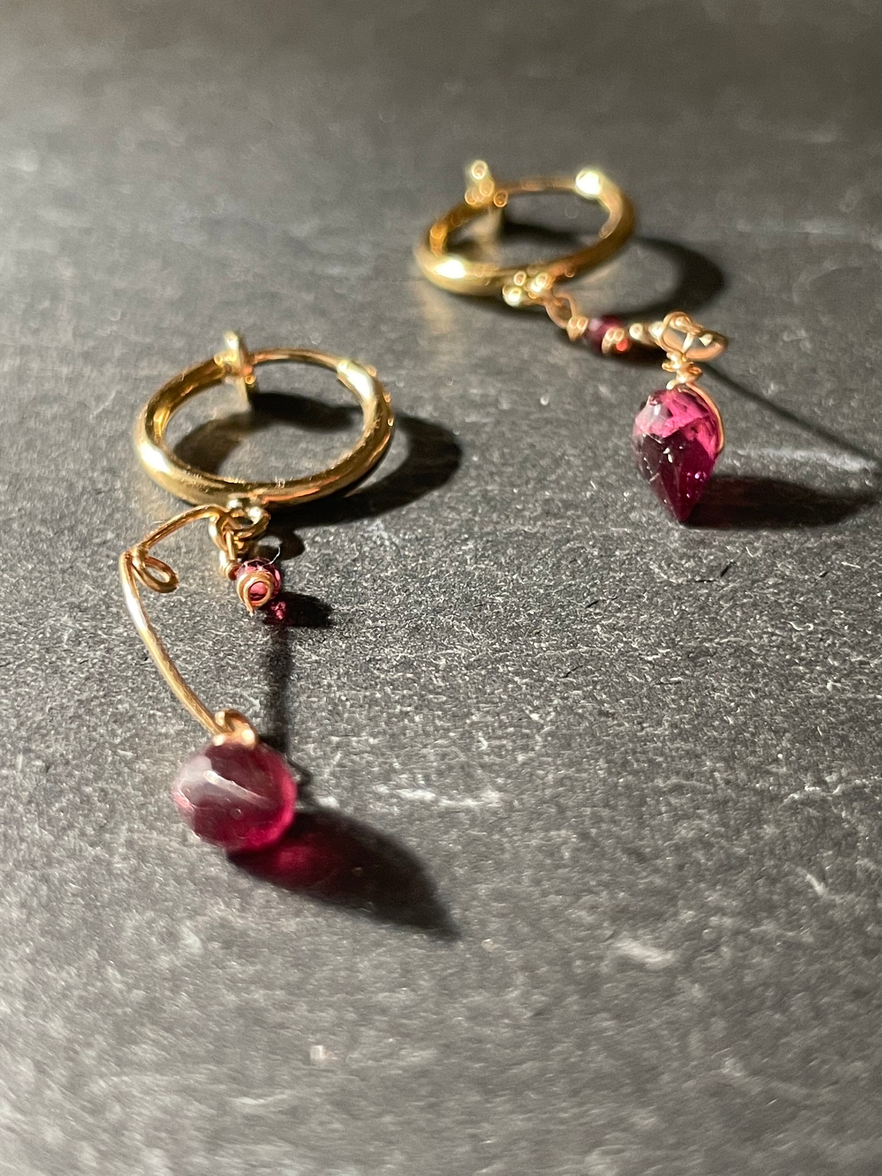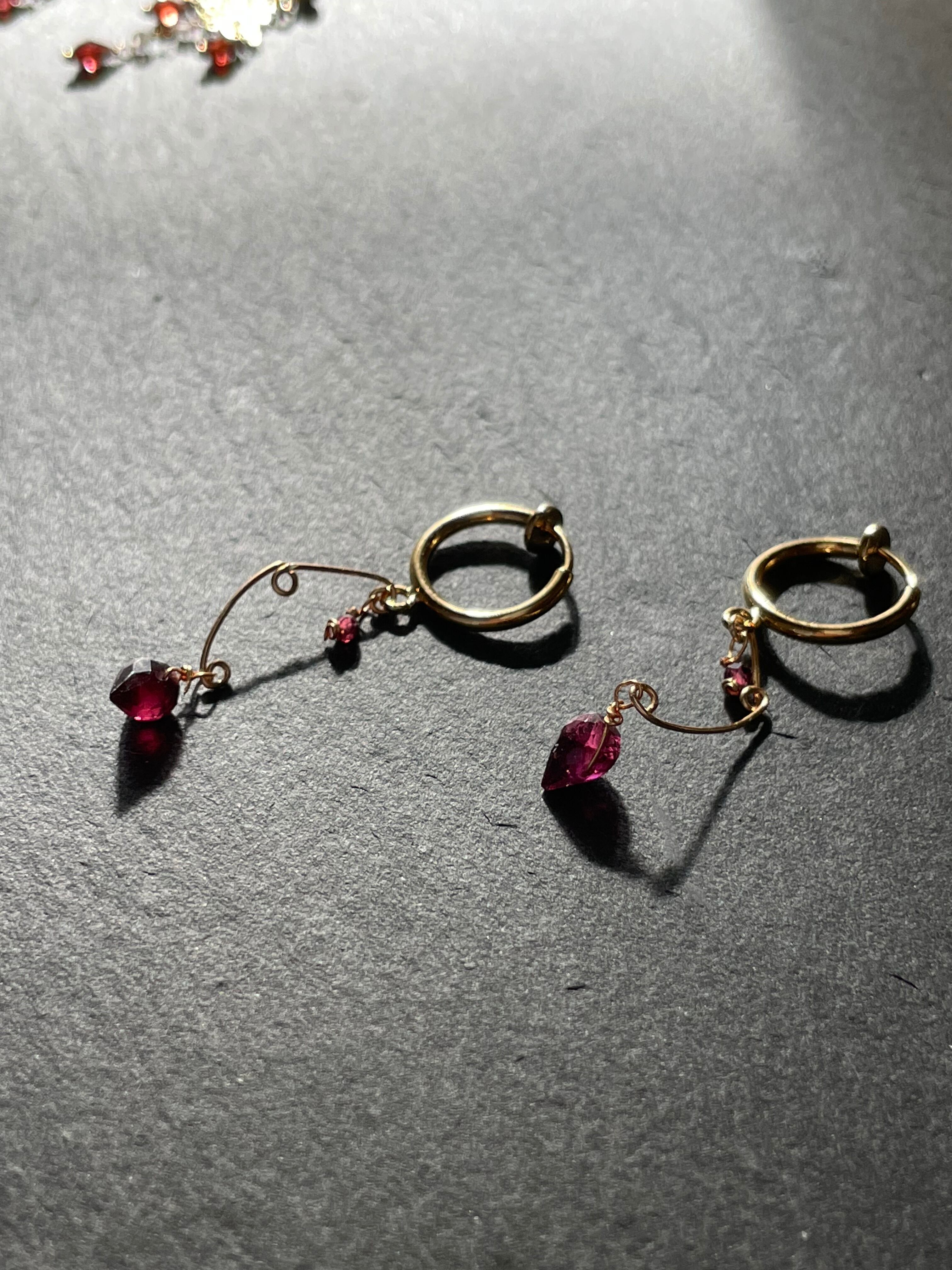小粒のガーネットが耳たぶの下で揺れる可愛く見えるデザインを計算してお仕立て致しました。