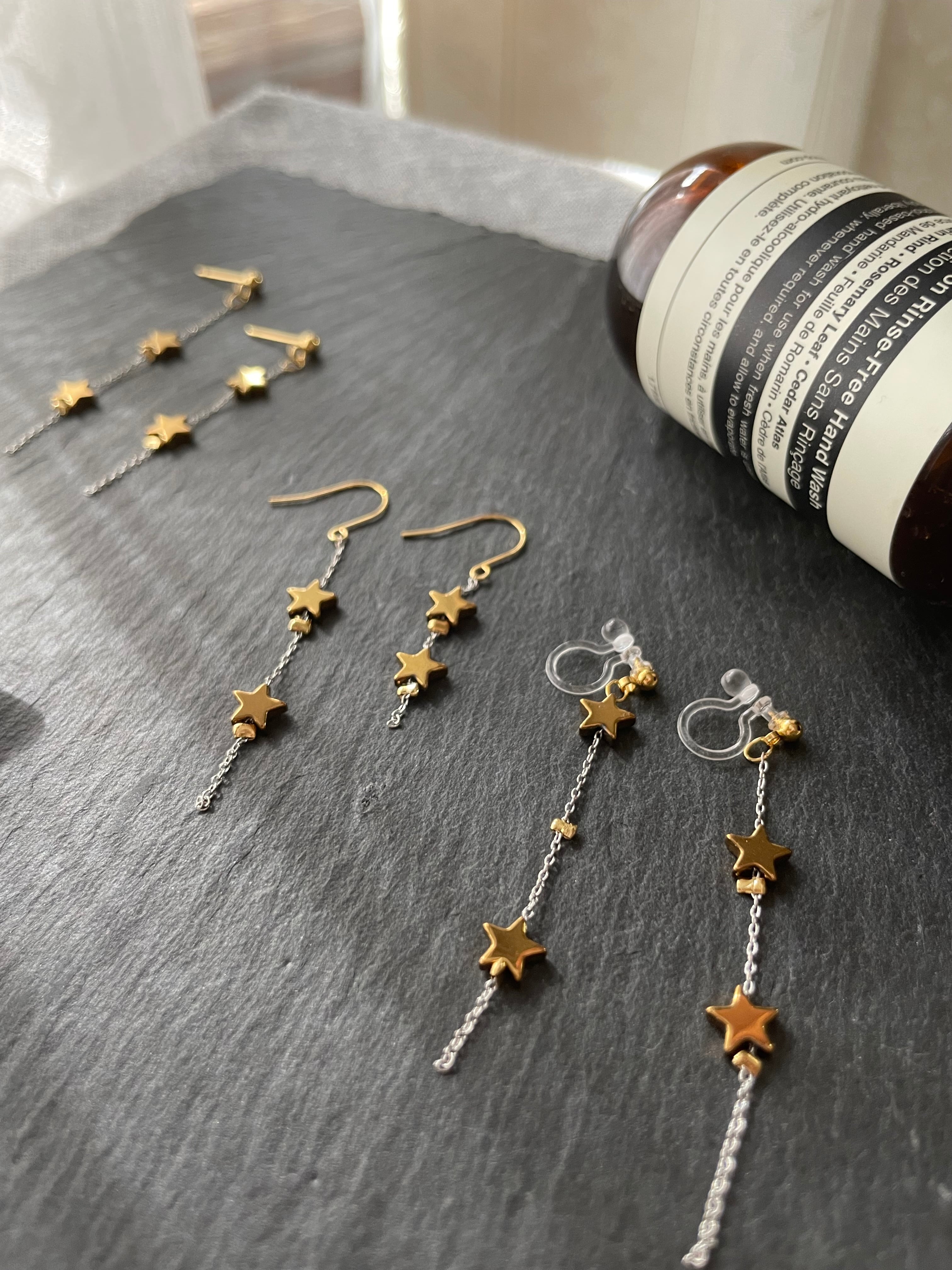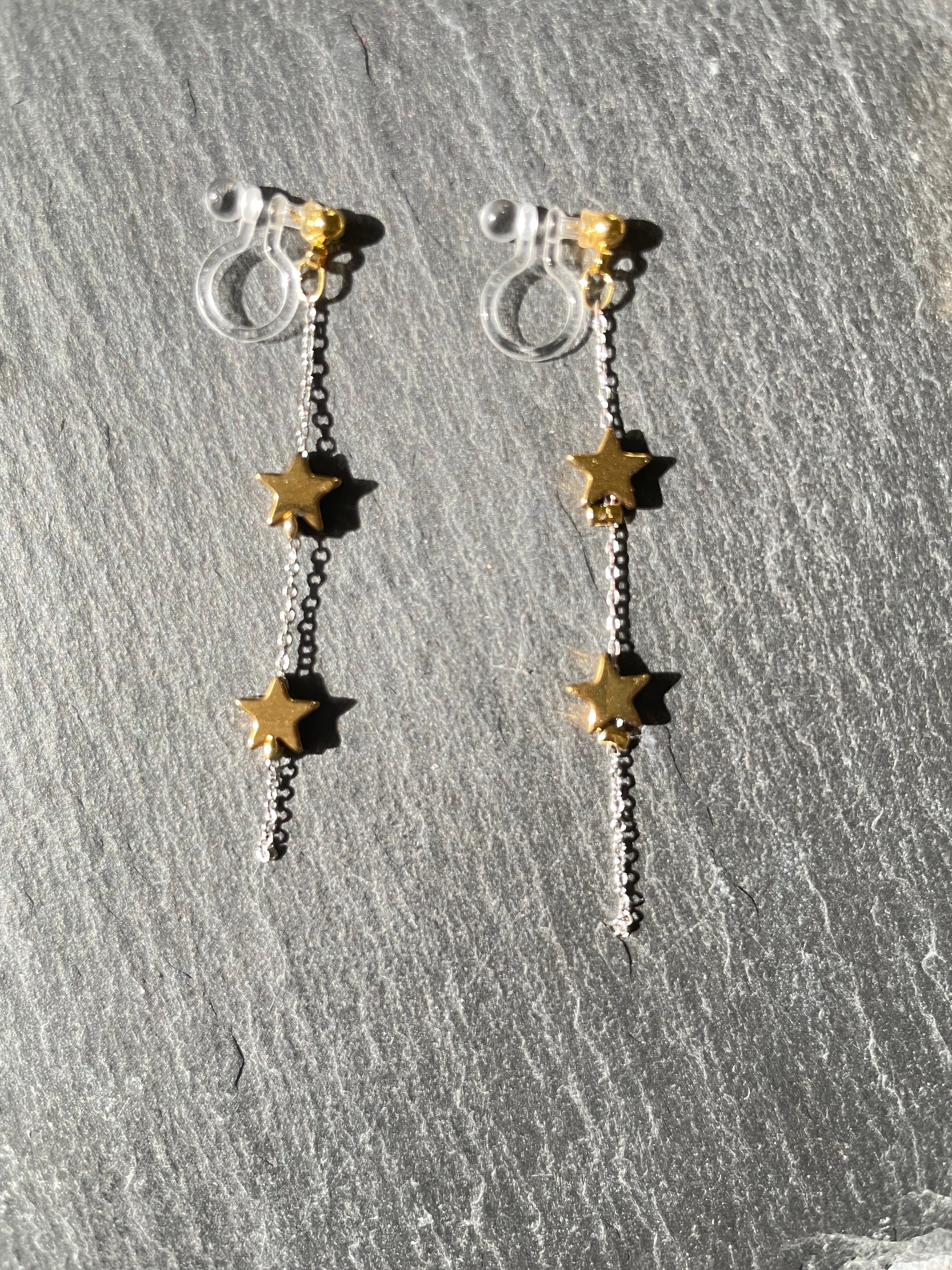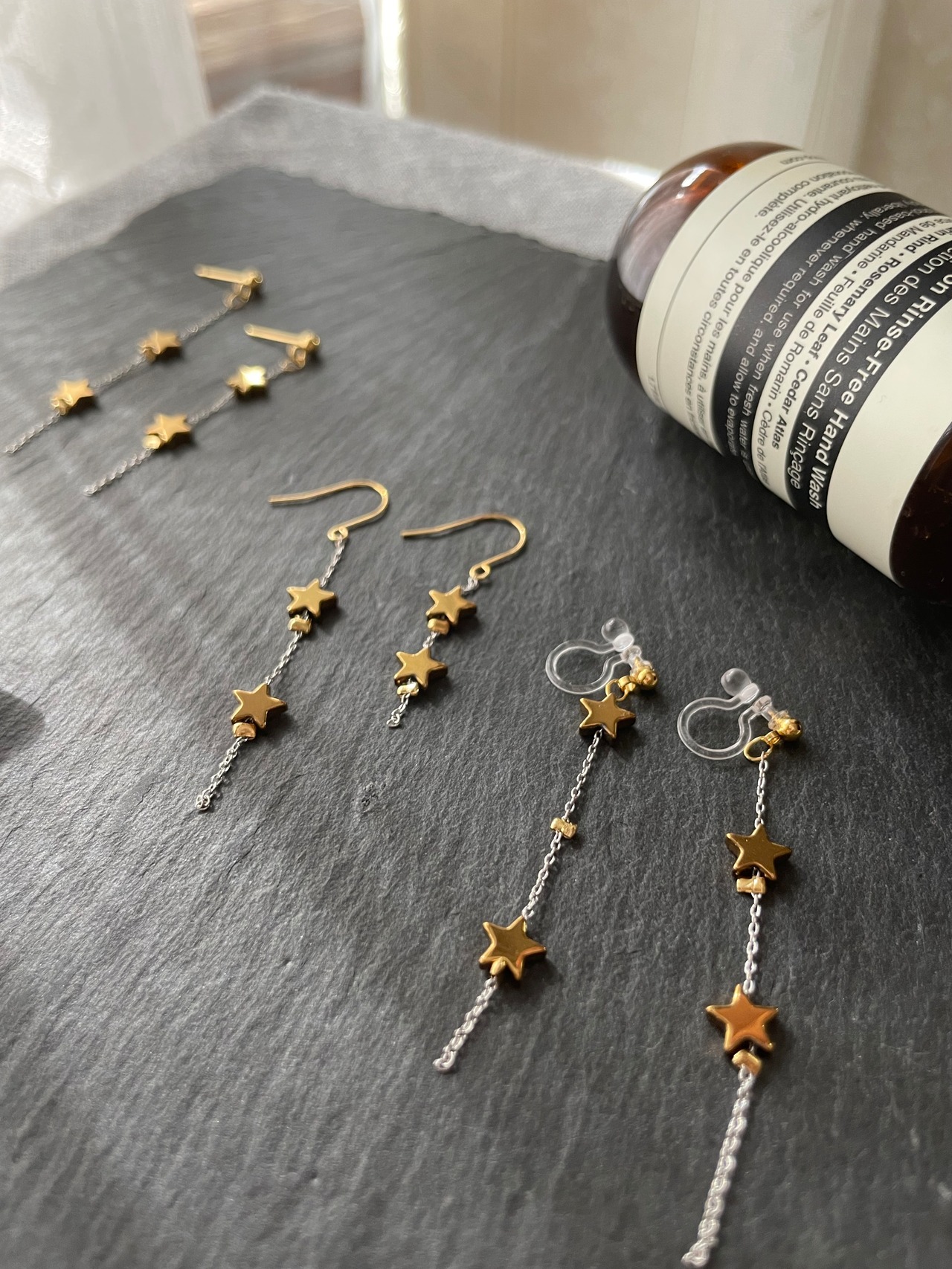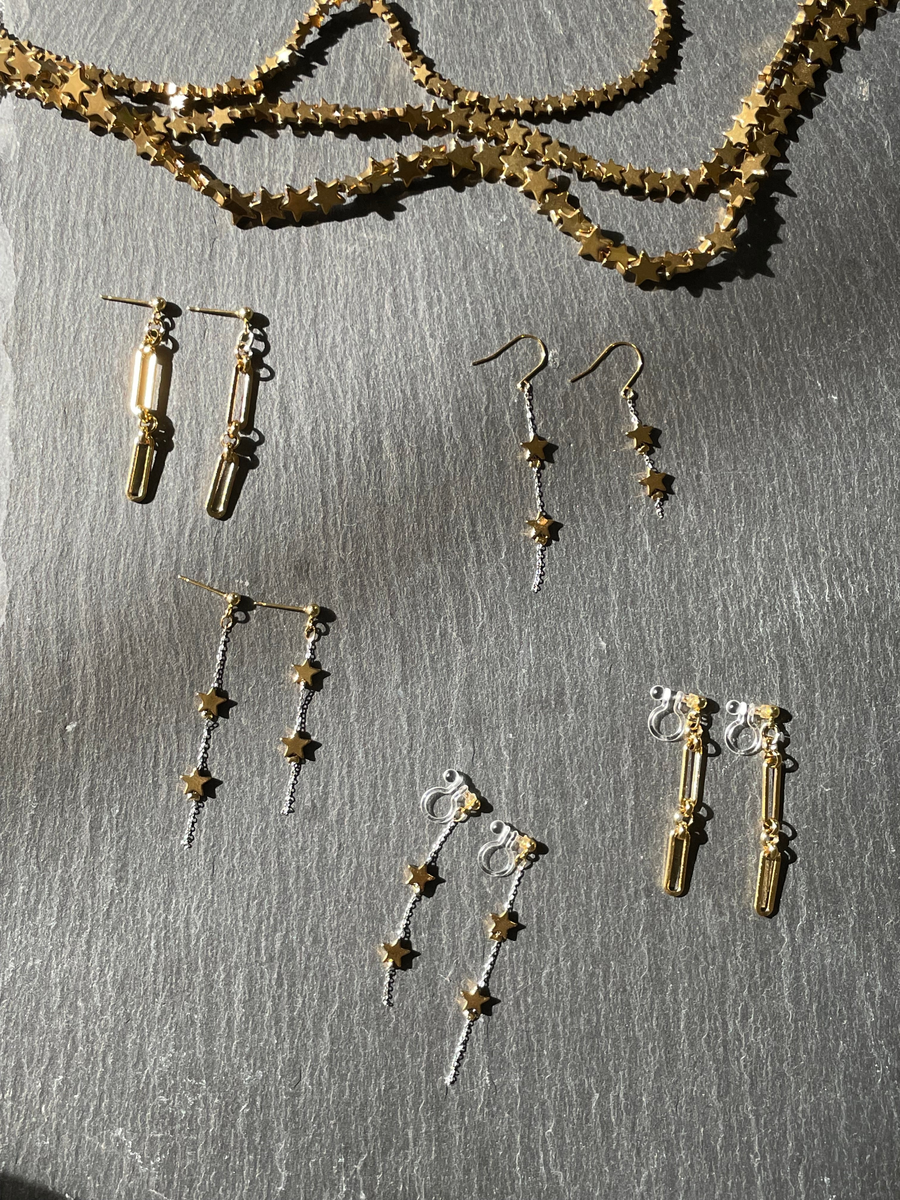 優しい金色のヘマタイト(天然石)が耳元で揺れる可愛いデザインに仕上げました。